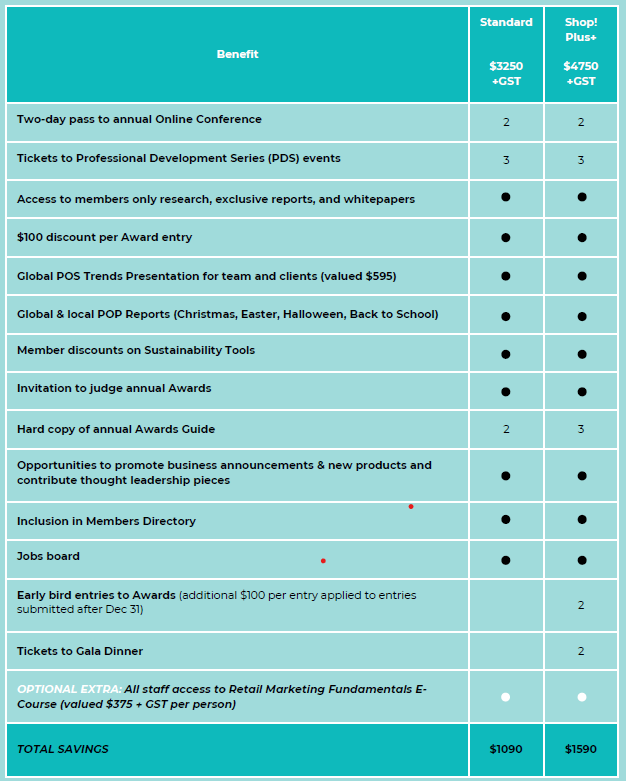 Shop! offers 12 month corporate memberships (unlimited staff members) from AU$3250+GST.
